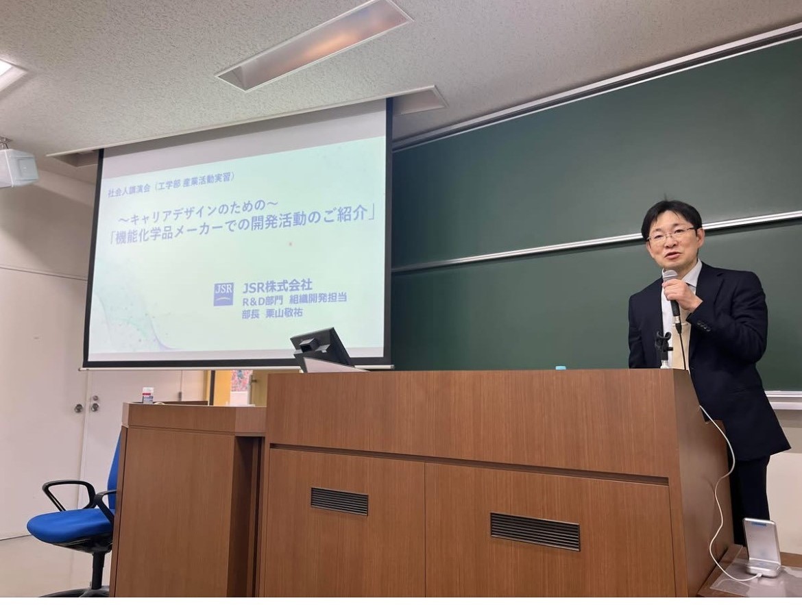 令和7年12月22日(月)JSR株式会社の栗山啓祐氏をお迎えし、応用化学コース学部生を対象とした 社会人講演会を開催しました。 企業での研究・事業紹介に加え、技術者として求められる姿勢や学生時代に身につけるべき力について お話しいただき、学生にとって進路を考える貴重な機会となりました。 当日は68名が参加し、活発な質疑が行われました。
