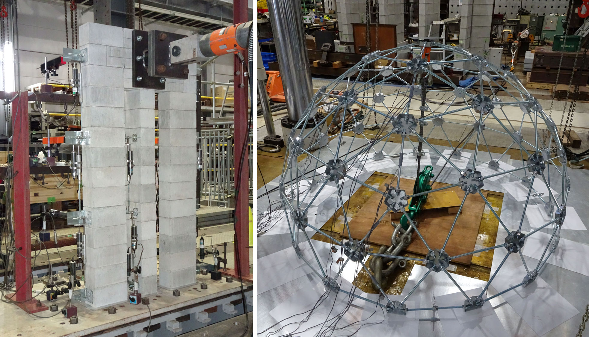 Photo Left: Out-of-plane horizontal loading test of dry masonry concrete block wall which is resilient to seismic force and wind pressure and has high degree of freedom in planning, Right: Vertical loading test of a geodesic dome composed of bolts and bent steel plates