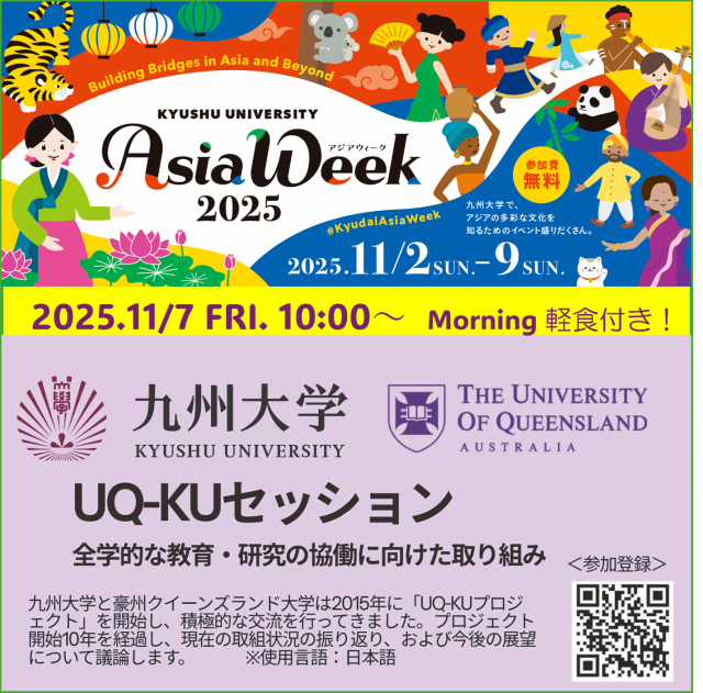 九州大学で実施されるアジアウィークの一環として、UQ-KUセッションが実施されます。