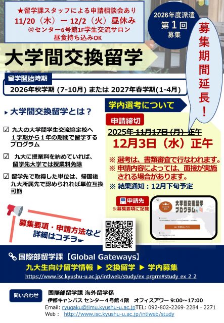 【問合せ先】国際部留学課海外留学係 <ryugaku@jimu.kyushu-u.ac.jp>