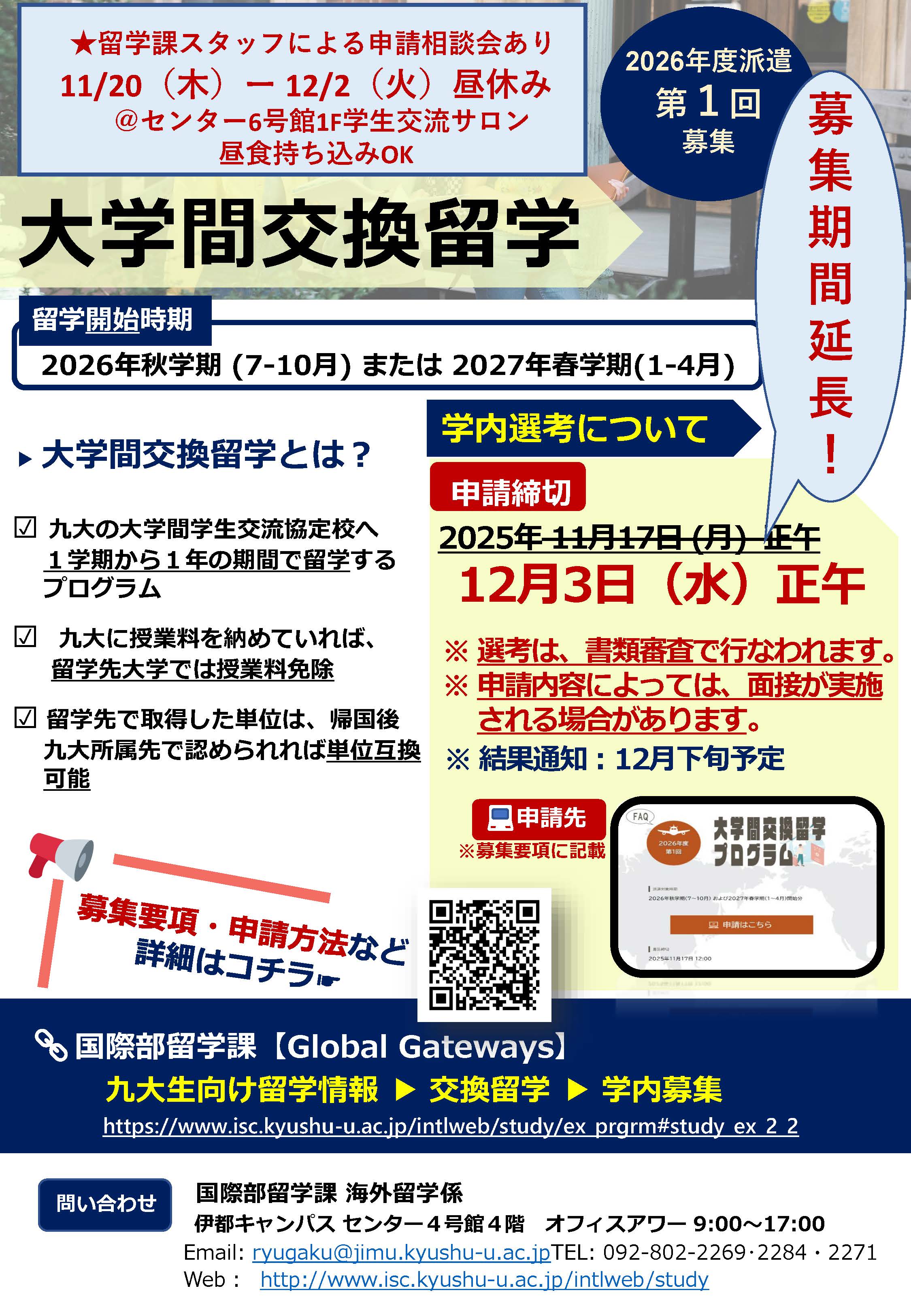 国際部留学課海外留学係より、2026年度大学間交換留学派遣第1回募集の締切延長のお知らせです。