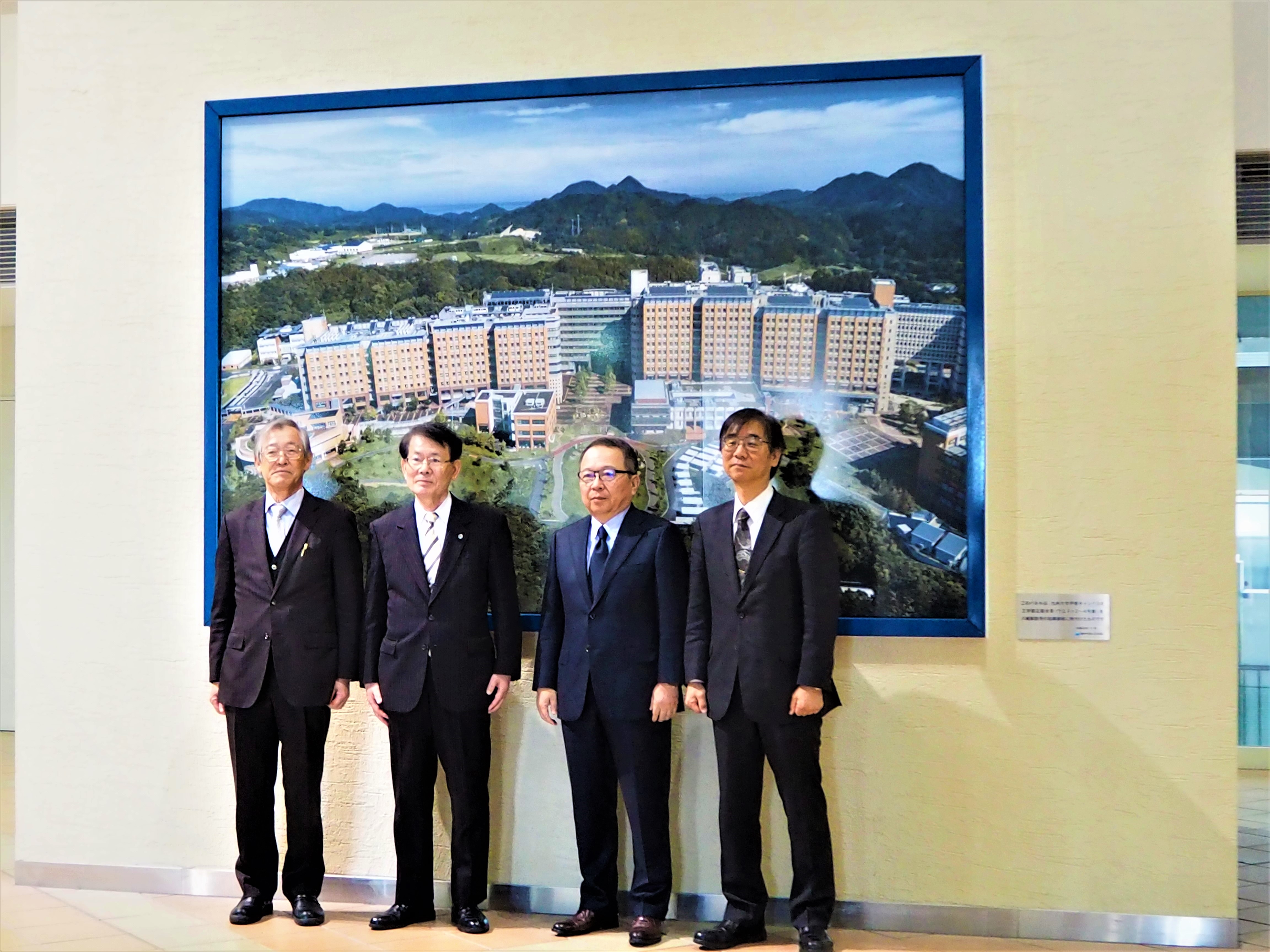 これを受けて、12月19日、同社谷本進治代表取締役副社長が来学され、モニュメントの前で九州大学久保千春総長から寄贈に対するお礼があった後、大学院工学研究院久枝良雄研究院長、鉄鋼リサーチセンター中島邦彦センター長、髙木節雄名誉教授と歓談されました。